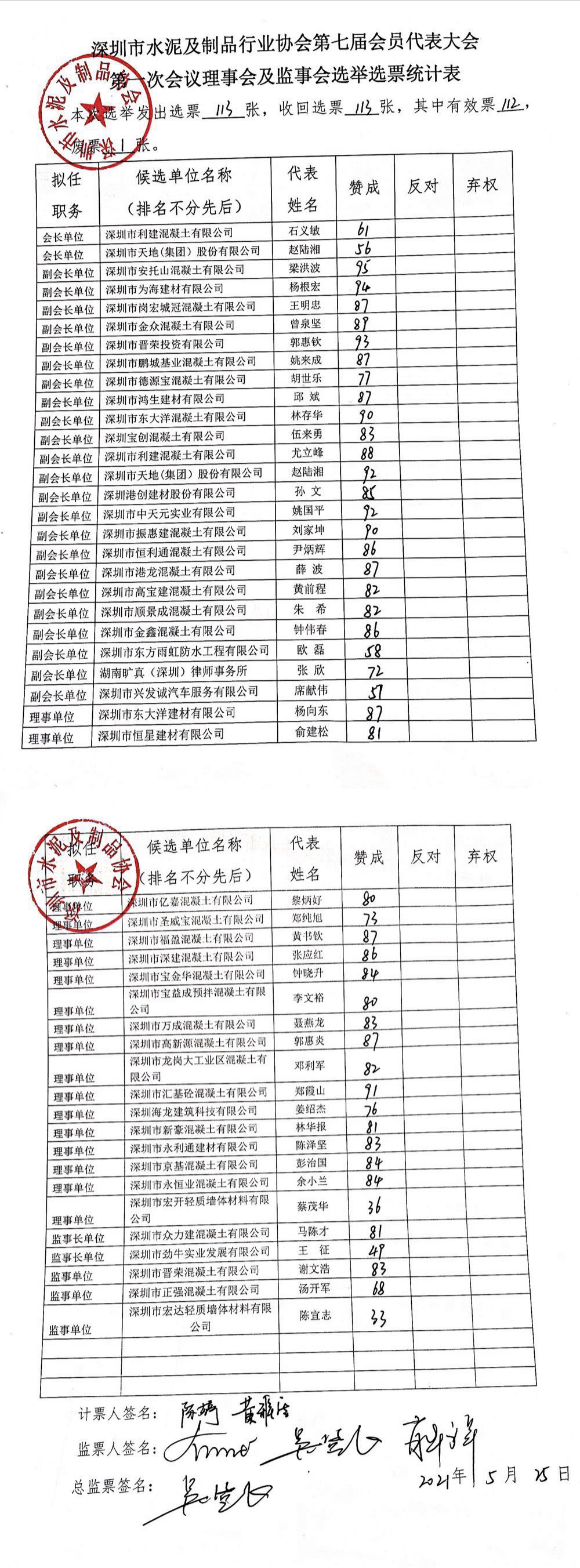 第二项议程:选举新一届会长单位及理事会成员单位。首先由万磊秘书长宣读协会换届选举办法并于大会举手通过,然后根据协会《章程》规定的选举程序,在监票人员的监督下采用无记名投票方式,选举产生会长单位、副会长单位、理事单位及监事单位,其中会长单位由现场唱票实时产生。经现场统计,实发选票113张,有效票112张、弃权票1张,两家会长候选单位分别得票数为:深圳市利建混凝土有限公司61票,深圳市天地(集团)有限公司56票;理事会单位得票情况详见附表。随后由协会万磊秘书长现场宣布会长单位投票结果:深圳市利建混凝土有限公司当选为新一届会长单位。