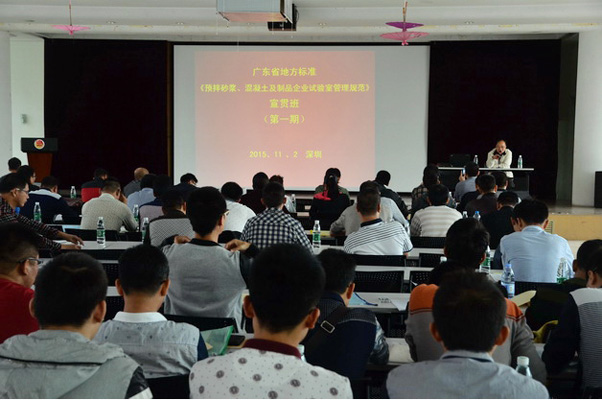 2015年11月2日,第一期广东省地方标准《预拌砂浆、混凝土及制品企业试验室管理规范》宣贯班在深圳举办,来自深圳、惠州、汕尾、潮州等市的预拌混凝土、预拌砂浆企业技术负责人、试验室主任及试验人员和检测单位的人员共150人参加了学习。