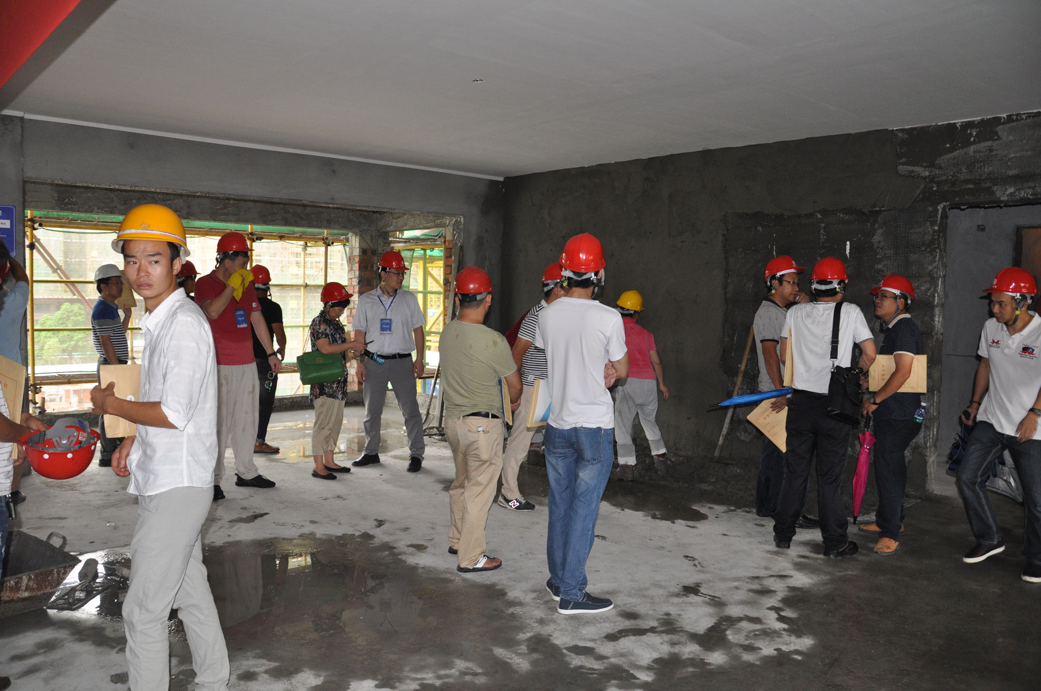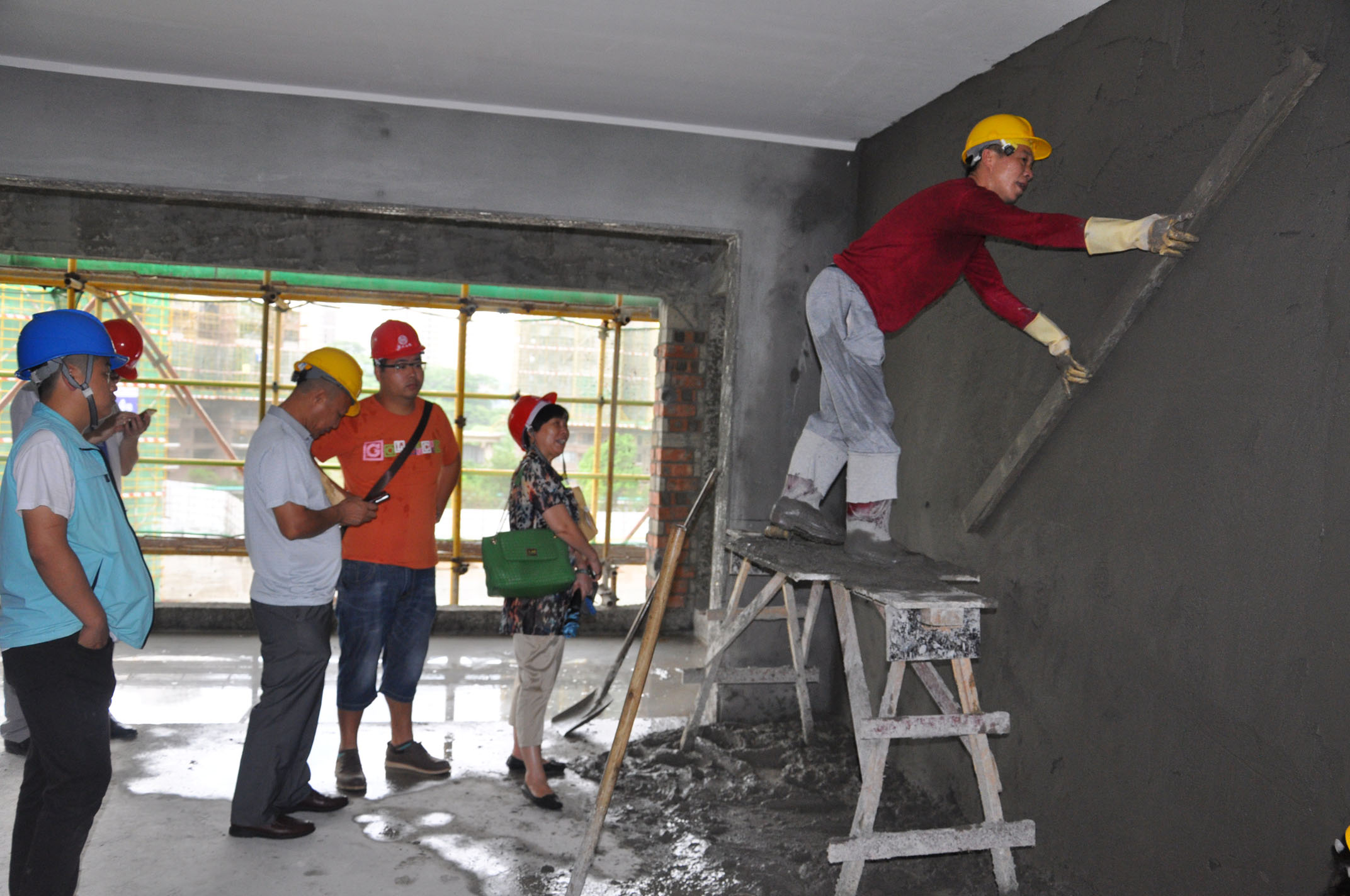 现场会共分为“政策与技术宣讲”及“现场施工演示与答疑”等几个环节。会议期间,我中心高级工程师张禹、工程师梁伟还就我省及中山市有关政策要求以及预拌砂浆分类、优点、常见质量通病及其预防处理措施等内容向参会人员进行了细致讲解。随后,参会人员分批次前往施工现场观摩预拌砂浆抹灰操作现场演示及已完工面的效果展示,同时,就施工应用、预拌砂浆性能、质量控制等方面进与现场技术讲解人员进行了充分的交流。