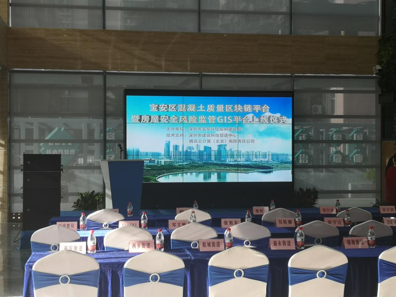 2020年1月9日上午9时,宝安区混凝土质量区块链平台暨房屋安全风险监管GIS平台上线仪式在宝安区住建局召开。本次会议由深圳市宝安区住建局主办,深圳市建设促进中心和腾讯云计算(北京)有限责任公司技术支持,深圳市和宝安区住建局领导及下属各街道负责人,以及宝安区24家混凝土企业代表等100多人参加了本次平台上线仪式,我协会陈爱芝会长与潘亚波秘书长也受邀参加了本次会议。