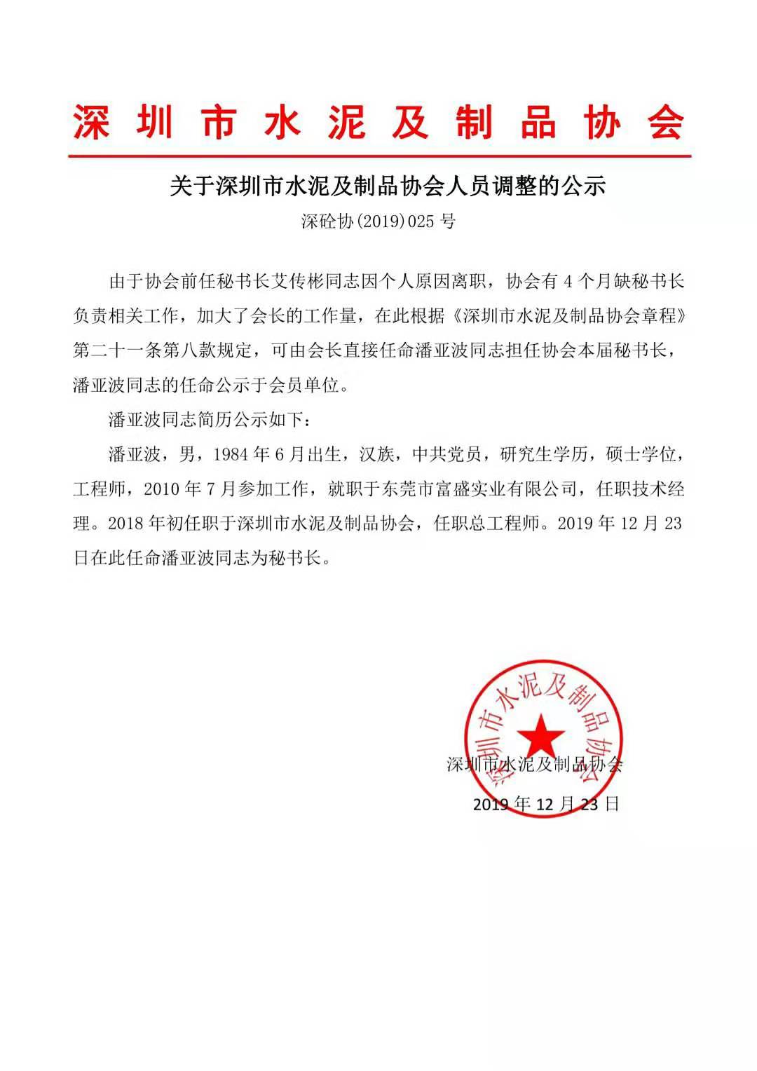 关于深圳市水泥及制品协会人员调整的公示.