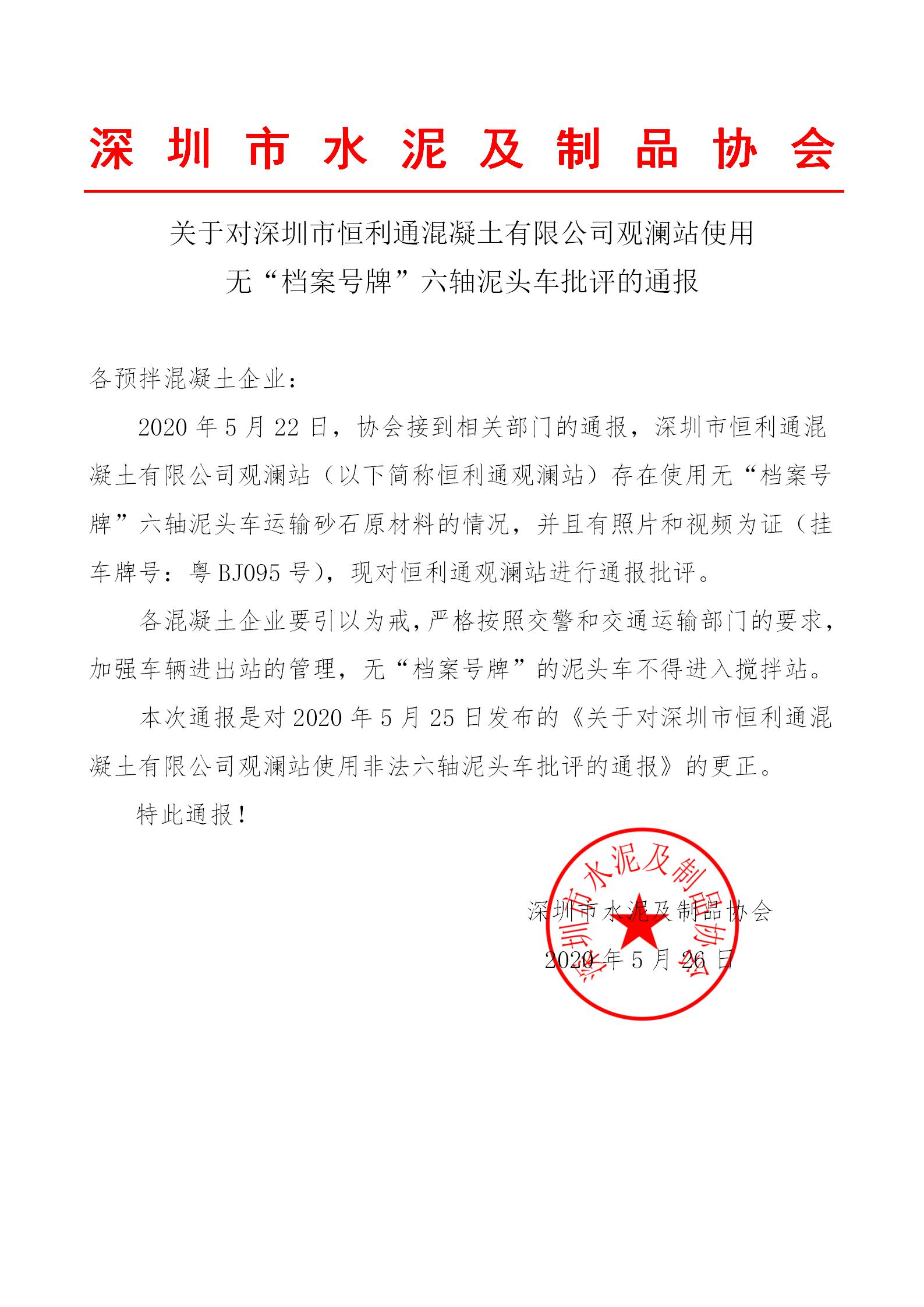 关于对深圳市恒利通混凝土有限公司观澜站使用无“档案号牌”六轴泥头车的通报批评